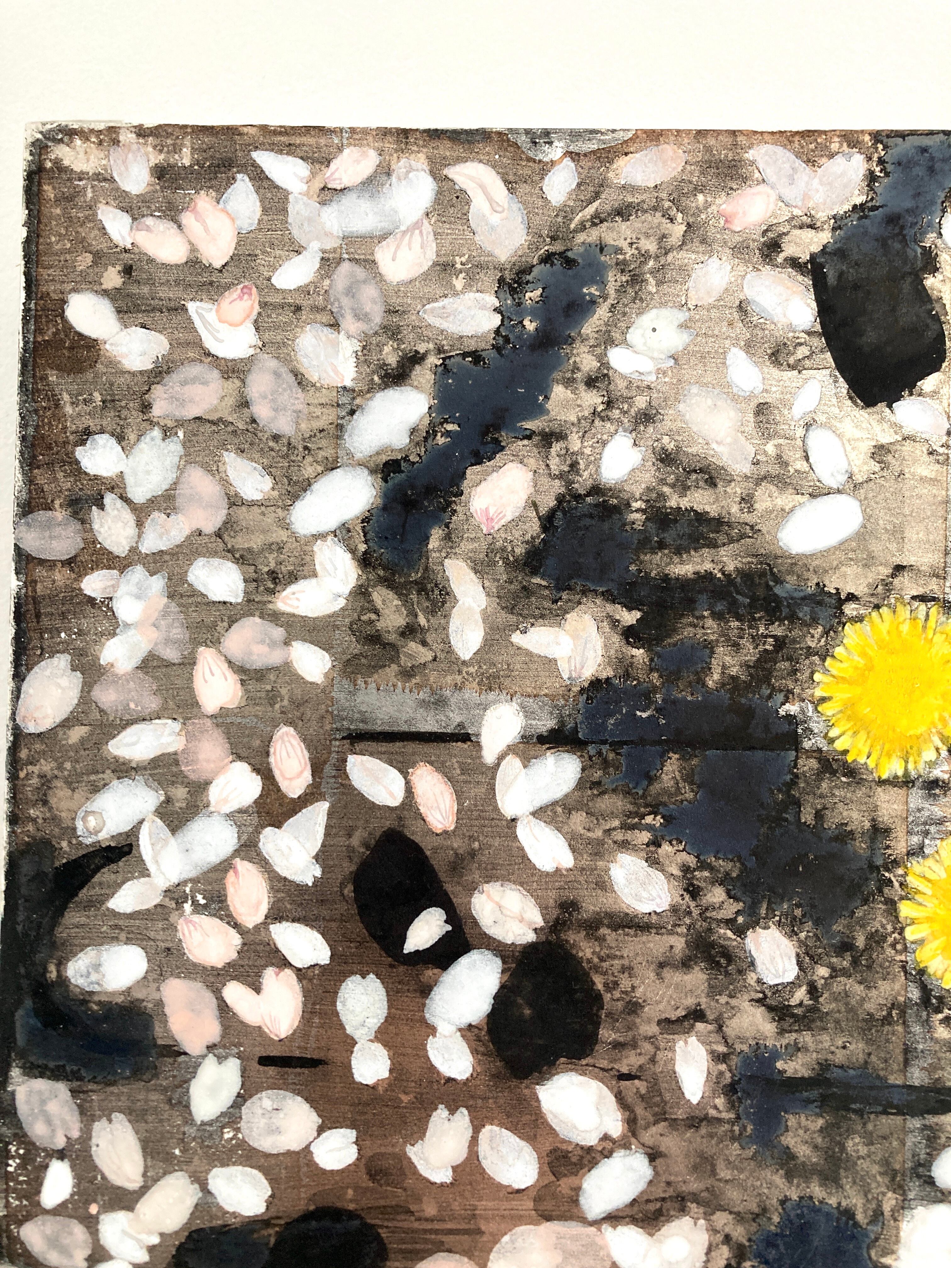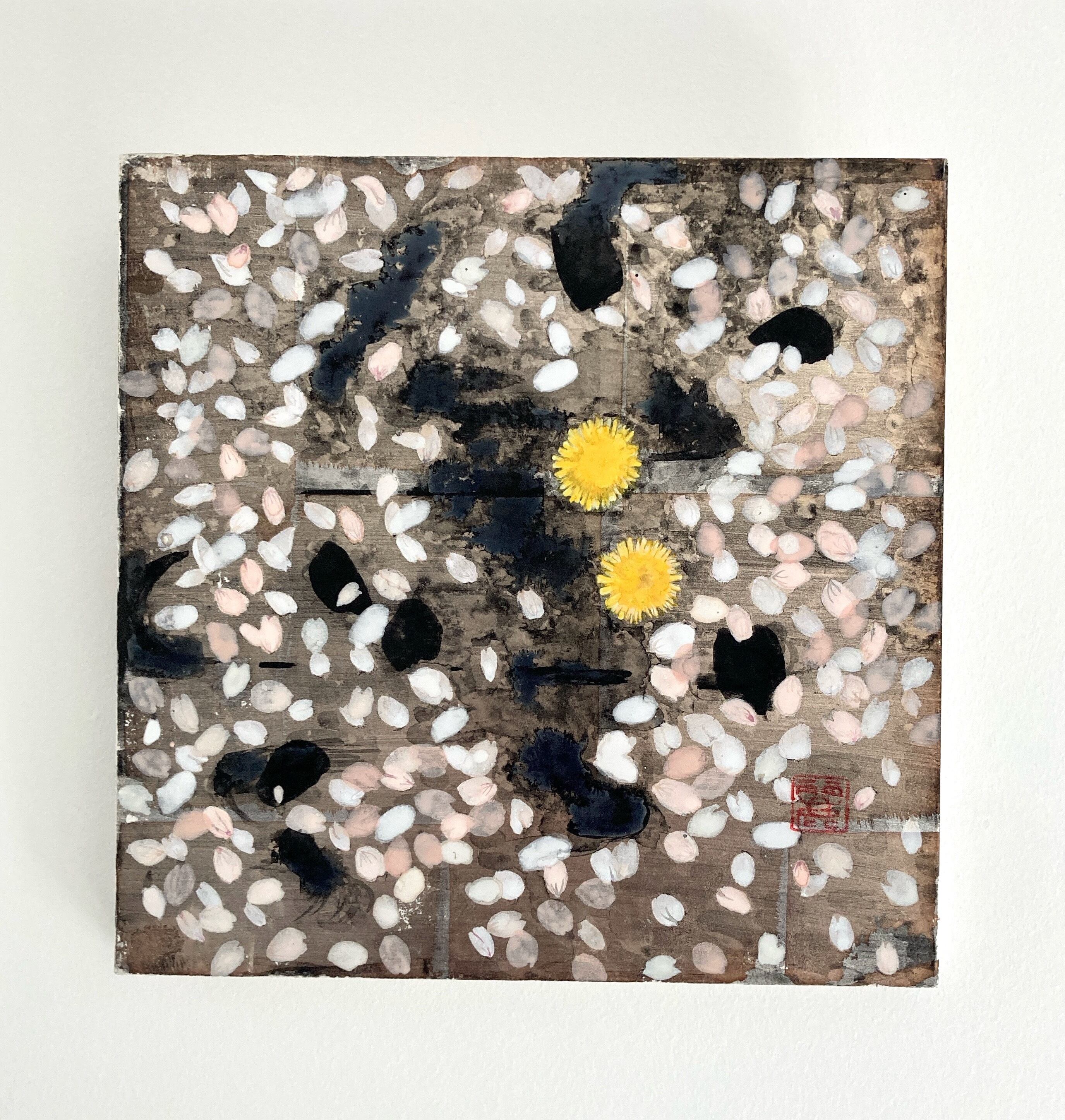 心を動かす日本画で、あなたの空間を彩りませんか。こちらの作品は、桜の花びらが水面に漂い、その中にたんぽぽの花が紛れ込んで流れていく様子を、画面いっぱいに描写した美しい作品です。下地には銀箔を使用しており、光の反射を巧みに表現しています。黒でコントラストを付けることで、印象的な深みを持った仕上がりとなっています。