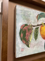 秋のモチーフ、柿を描いた日本画であなたの空間を彩りませんか。こちらの作品は木製パネルに和紙を張ったタイプで、直接お部屋に飾れる作品です。清々しい青空をイメージした背景のブルーの岩絵具と柿のオレンジ色がお部屋を明るく見せます。インテリアにぴったりのアイテムとなっています。